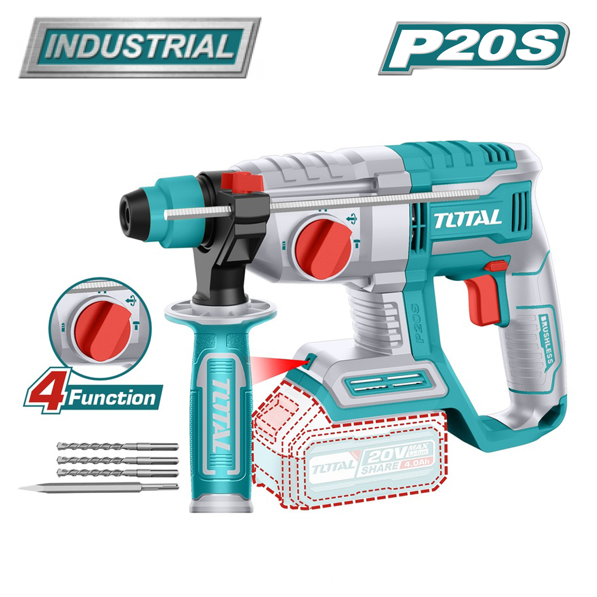 - Перфоратор входит в линейку инструментов TOTAL P20S и совместим со всеми аккумуляторами TOTAL 20В — TFBLI20011, TFBLI2002, TFBLI2053.