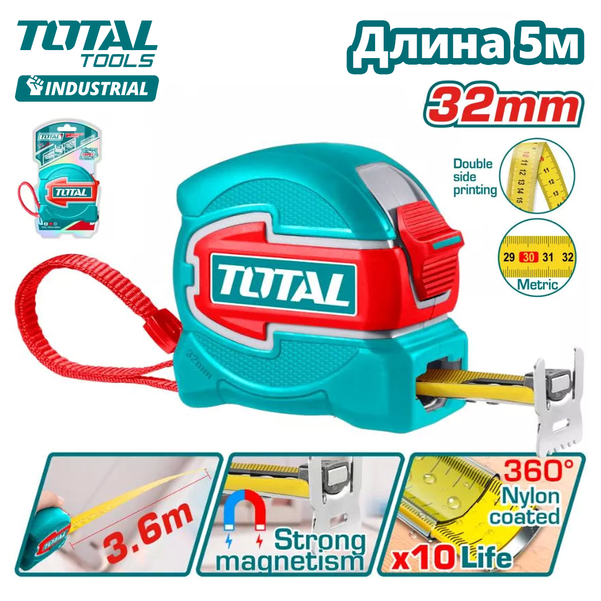 Длина 5 м; ширина 32 мм; магнитная; двухсторонняя метрическая шкала